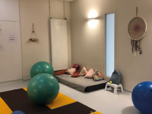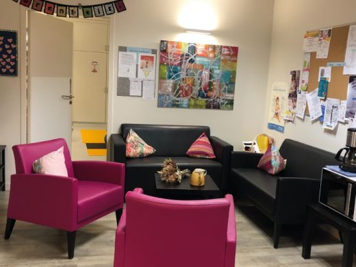 Un lieu partagé entre les professionnels et les couples faisant office de salle d’attente, secrétariat et salle de pause pour favoriser les échanges.