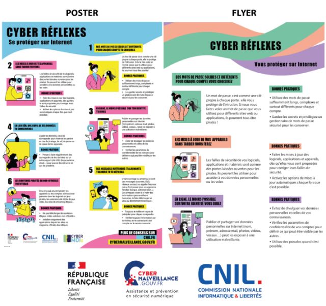Découvrez un poster et un flyer présentant les bons réflexes numériques à adopter : mot de passe fort, prudence sur les réseaux sociaux, vigilance face aux escroqueries en ligne, ...